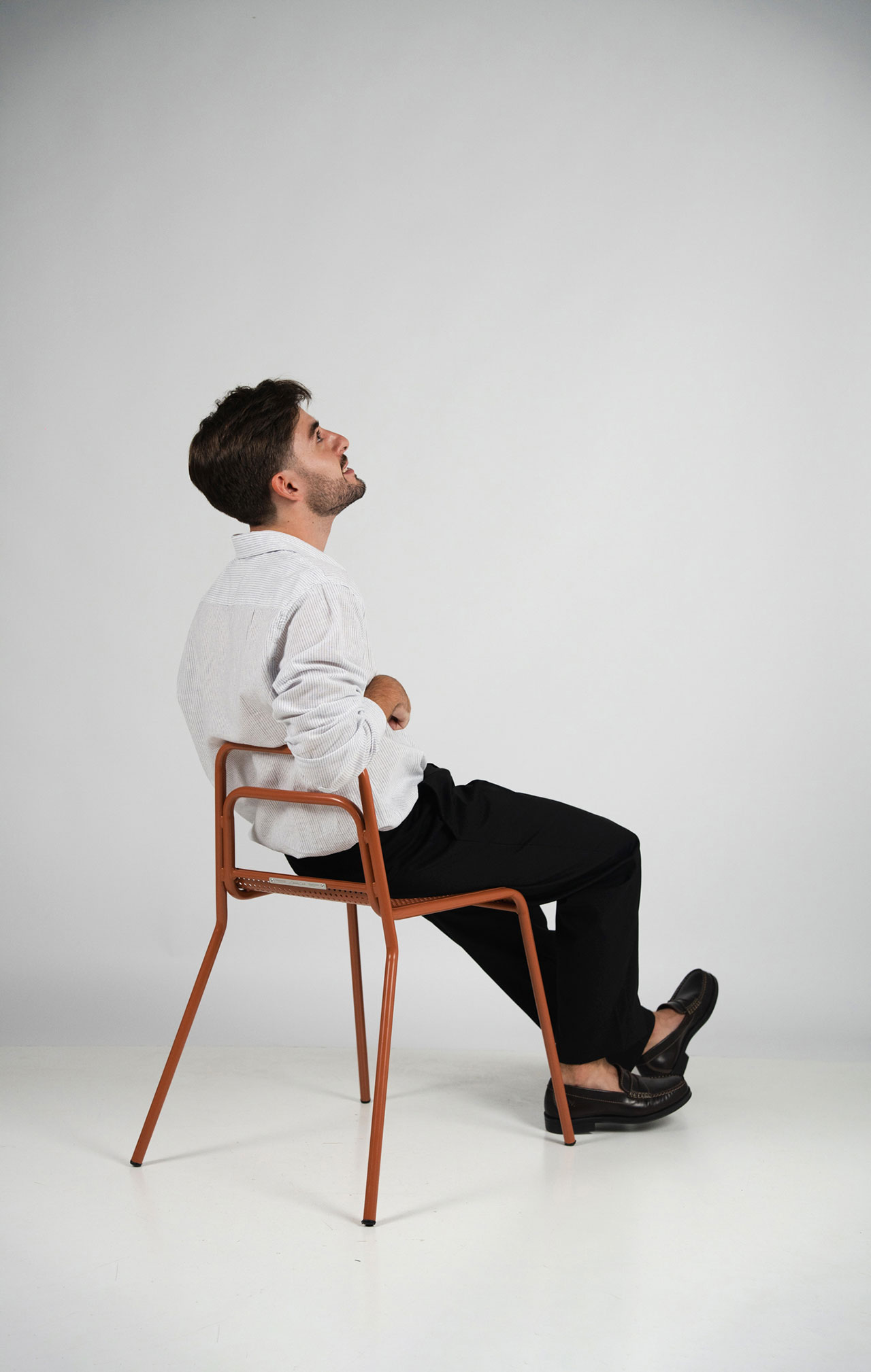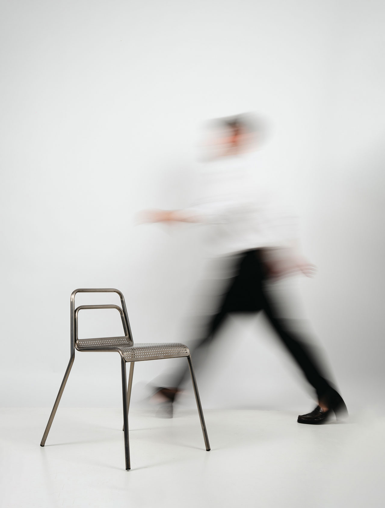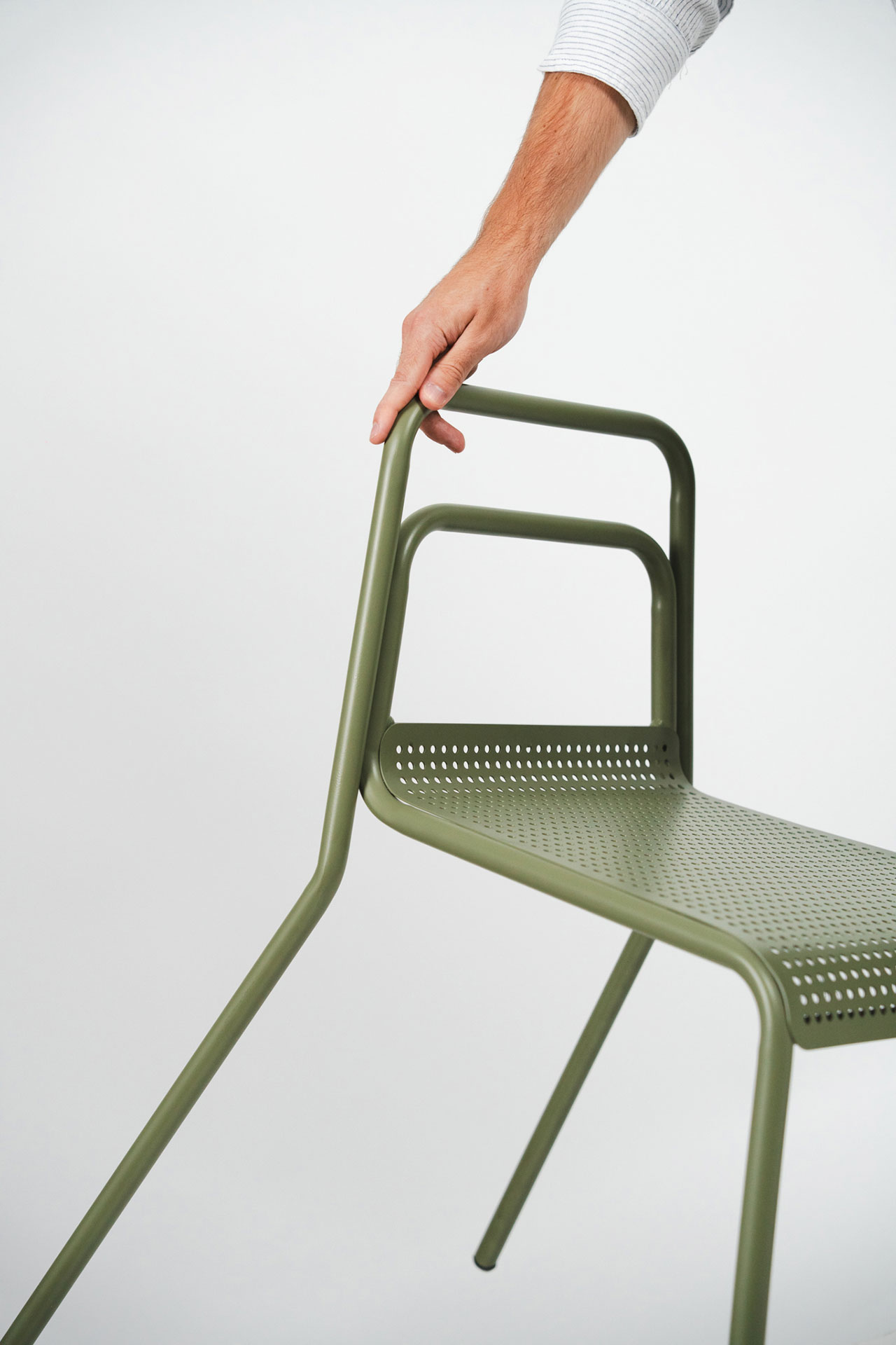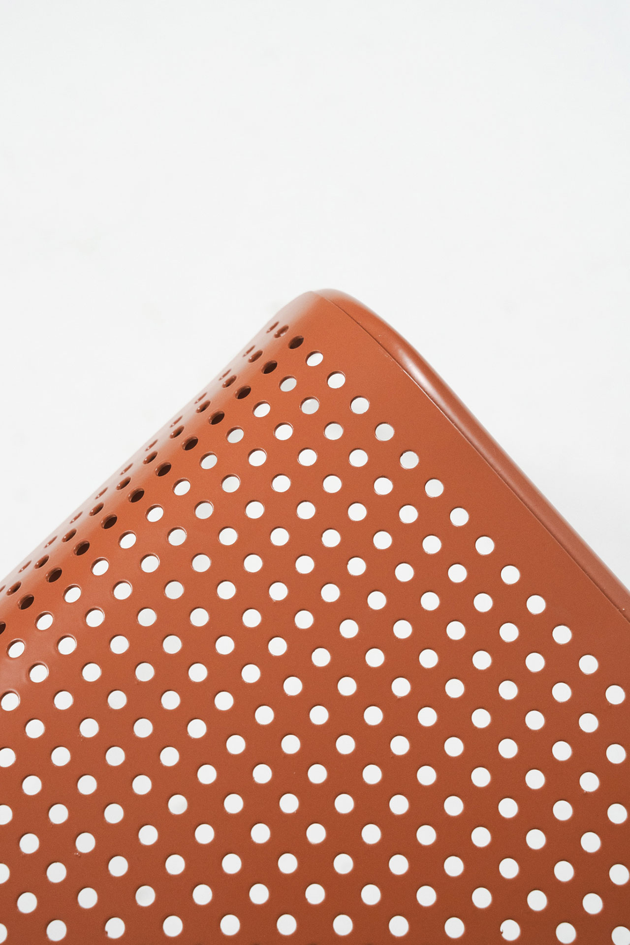 Settecento椅延续Gio Ponti 699 Superleggera的轻盈逻辑,并以钢材重新构建结构表达。两根连续弯曲的金属管一体形成椅腿与靠背,将支撑简化为清晰的线性框架;座面采用CNC激光切割穿孔钢板,在减重的同时实现通风与排水,适配室内外场景。靠背以双横杆替代单横杆,提高受力分布与操控稳定性。表面提供咖啡色、陶土色、开心果绿与透明金属涂层等粉末喷涂方案。整体在工业制造与手工细节之间建立平衡,强调结构的直接性与使用的稳定感。