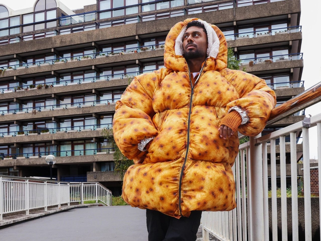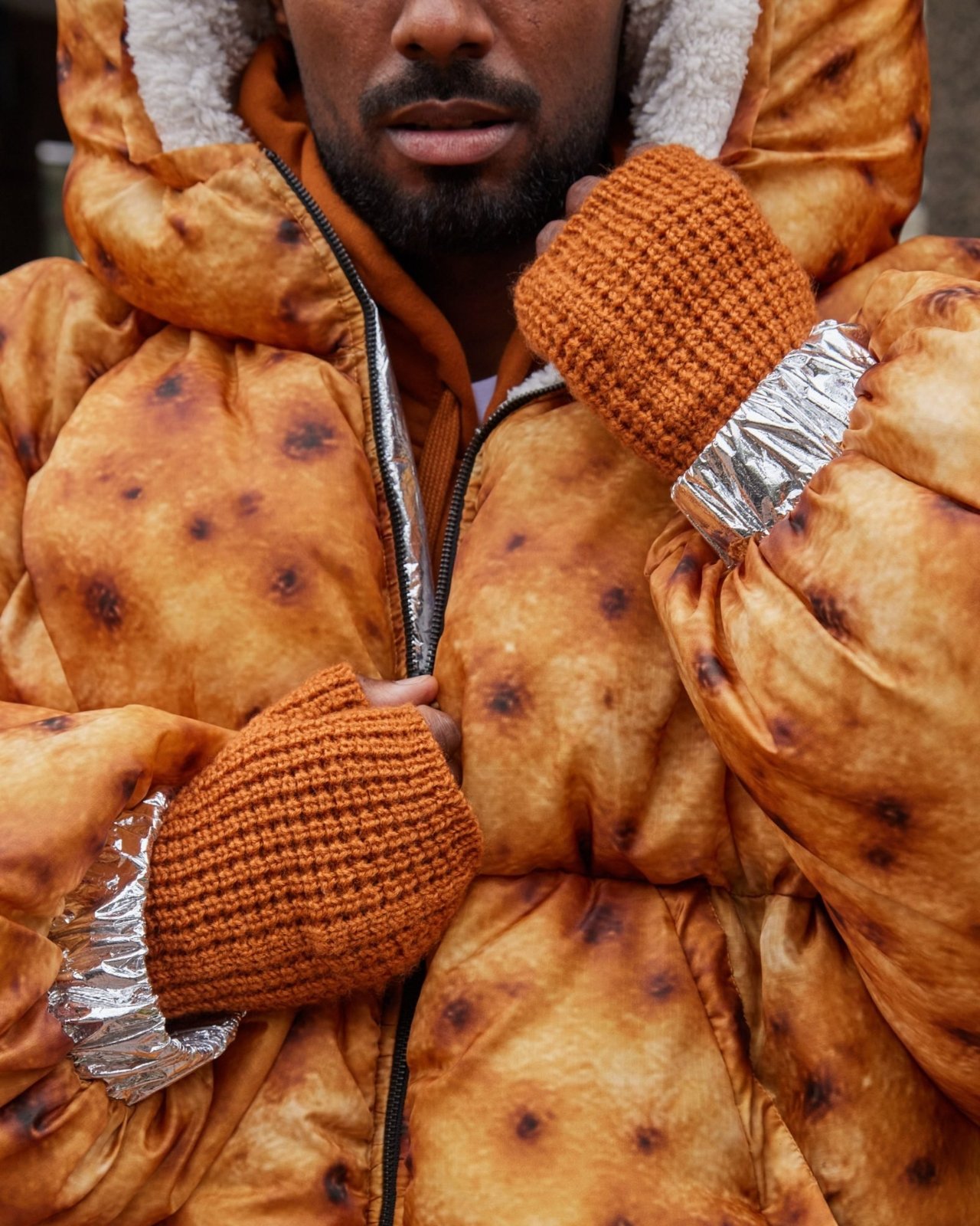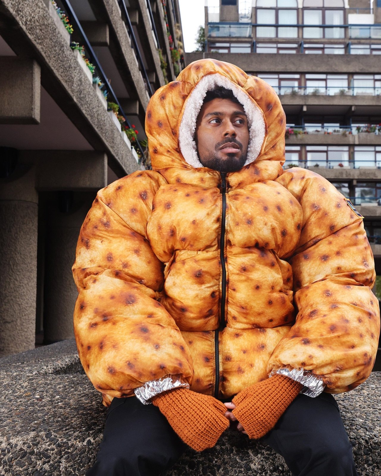 当超市与天后设计师联手,时尚真的“离谱”了——Aldi × Agro Studio 推出“薯条夹克”(Jacket Potato Jacket),一件长得像烤土豆的羽绒服。外层是坑洼棕皮,内里雪白绒毛,配一件银色锡纸雨罩,从头到脚演绎“被吃掉”的仪式感。灵感来自英国人最爱的秋日美食:夹心烤土豆。40%的当地人认为十月正是“烤土豆季”,既想保暖,又想吃碳水?这件夹克一次满足。设计细节满分:表皮模拟焦脆薯皮,内里复刻绵软口感,穿上就像行走的热腾腾晚餐。更妙的是,它不卖,只送。通过社交媒体互动抽奖,限量发放,瞬间变成潮流圈新晋“虚拟货币”。拍摄地选在伦敦地标巴比肯中心,曾是哈利·斯泰尔斯MV与007电影取景地,如今为一件土豆外套打光。这是一次正经的“不正经”。当高定遇上平价超市,当食物成为时装,幽默本身成了最高级的设计语言。
