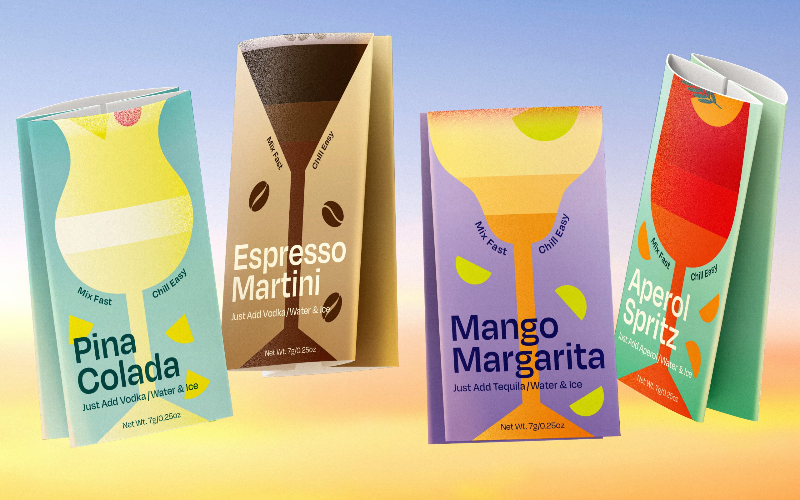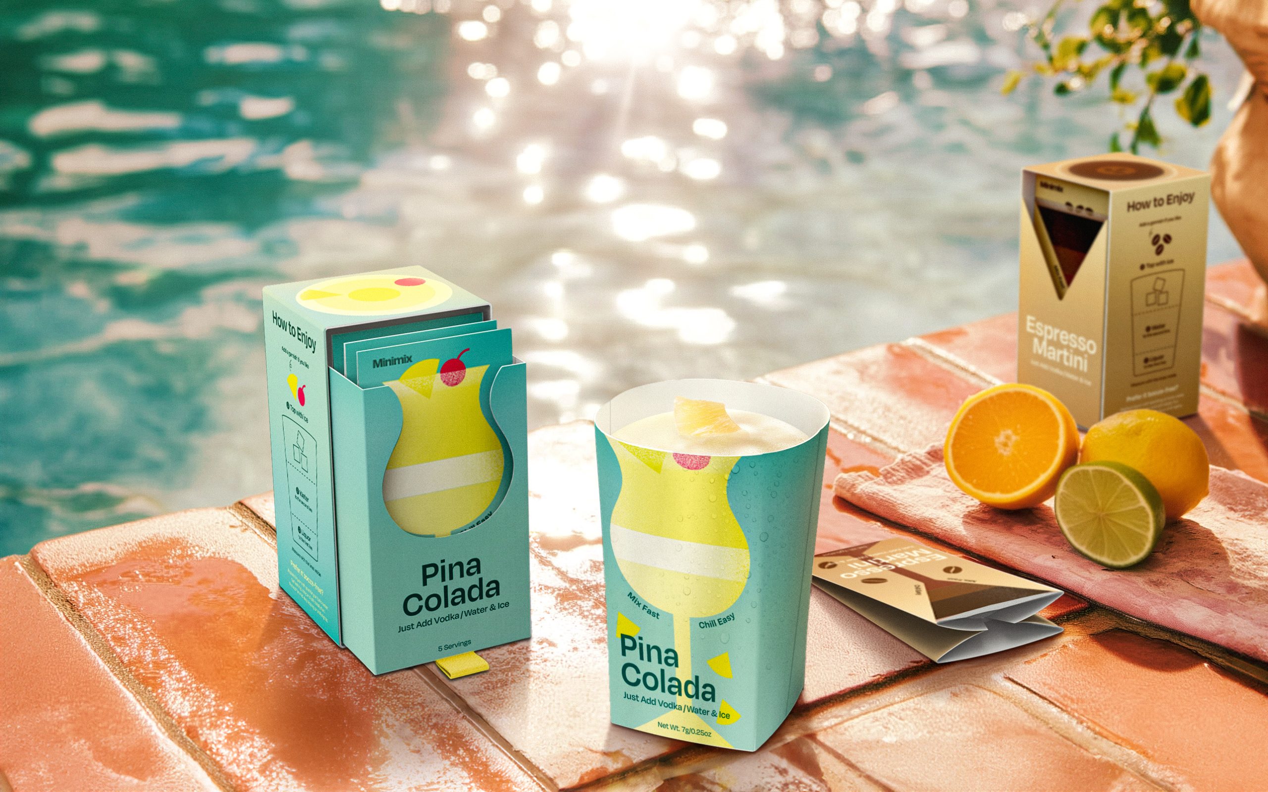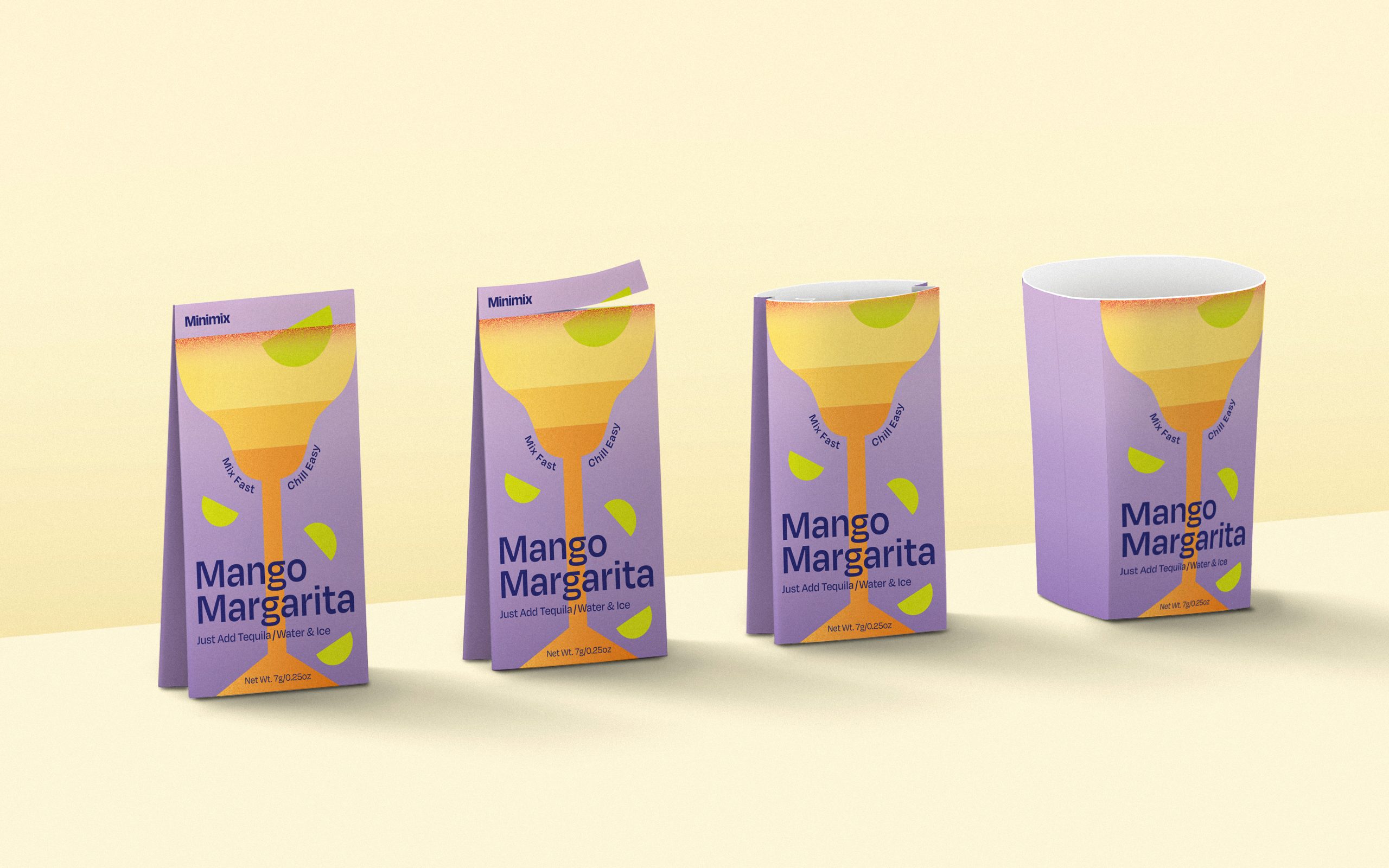 Minimix 是一种为当代社交场景而生的鸡尾酒新形态。通过大胆明快的色彩与简化图形,将经典鸡尾酒以更年轻、直观的视觉语言重新演绎,让饮酒体验变得轻松而包容。每款产品以标志性酒杯造型为视觉符号,弱化传统的正式感,强调分享与即兴。产品采用单人份自立袋设计,每袋约350ml,内含鸡尾酒粉末,撕开即可作为杯子使用。既可加入烈酒调制鸡尾酒,也可加水变成无酒精特饮,满足不同人群的共同参与。轻量、便携、易清理的设计适用于派对、野餐、音乐节等多种场景,让鸡尾酒成为连接人与人的社交媒介。