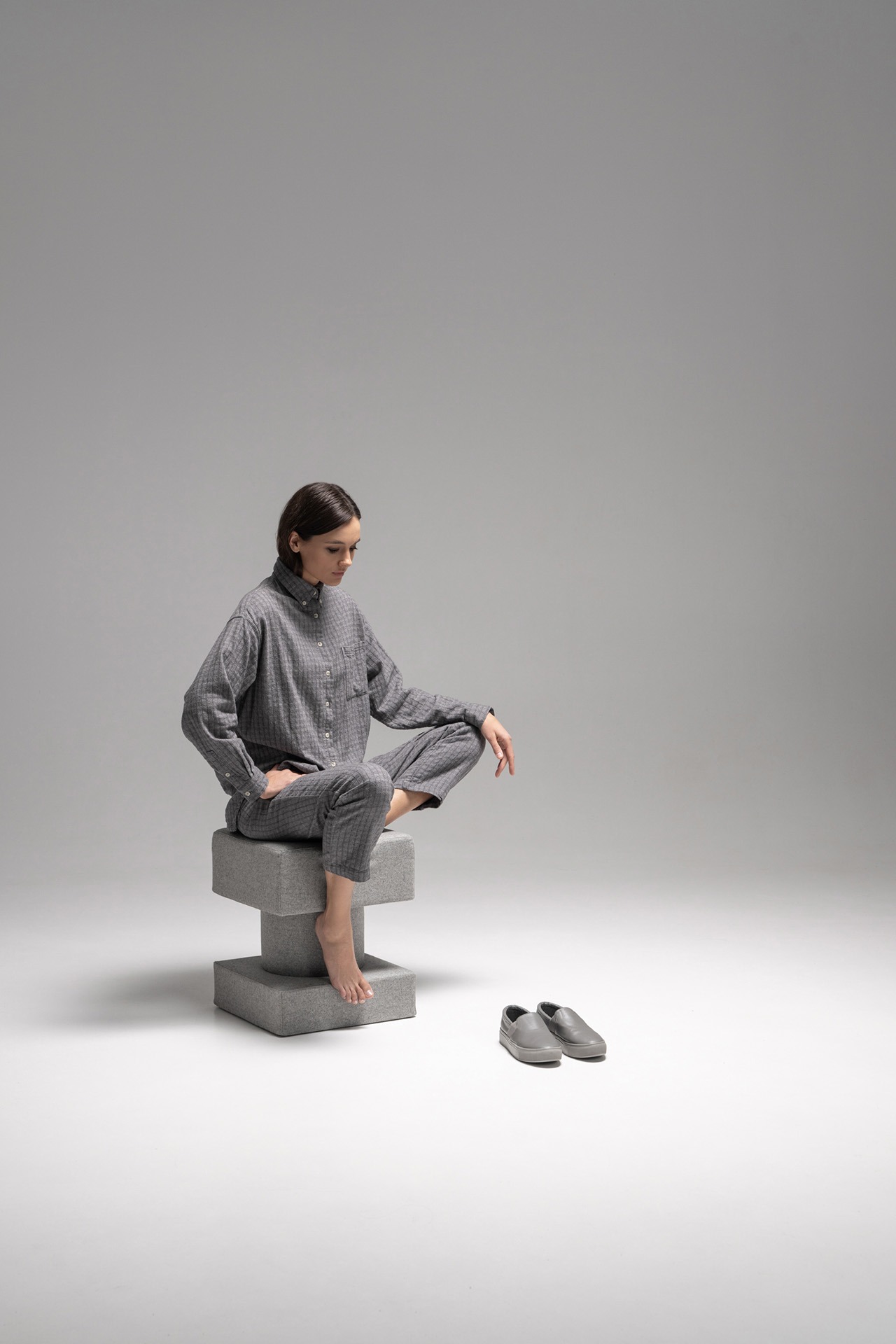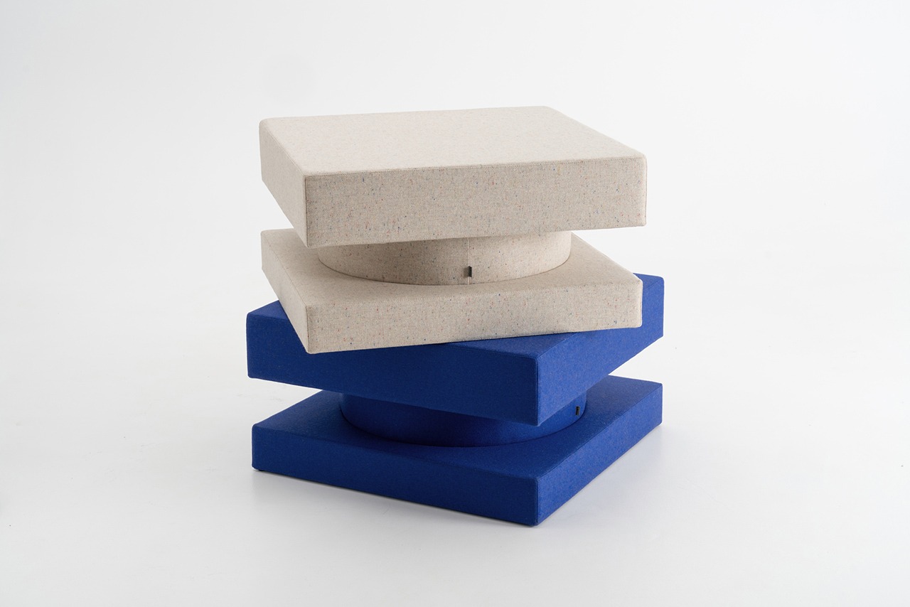 TAITŌ是+kouple工作室首次涉足家具领域的蒲团设计,由Dan Vakhrameyev设计,名称源自日语“対等”,指向体量与力量的平衡关系。产品以中央圆柱体连接两个柔软方形体块,形成看似不对称却稳定的结构,在清晰几何轮廓与真实触感之间建立张力。其造型具有明确的高度与边界感,但通过软性材料消解锋利感,使结构与舒适并存。内部采用胶合板与高密度纤维板构成稳定支撑,外覆商用级羊毛面料,兼顾耐用性与触感。不同尺寸对应多种使用场景,可作为凳、脚踏、坐垫或游戏垫;多个单元还可自由堆叠、组合,形成临时隔断或群体坐具,强化其系统化与开放使用属性。