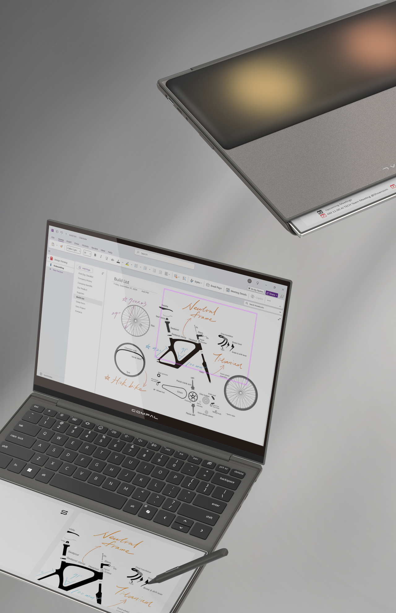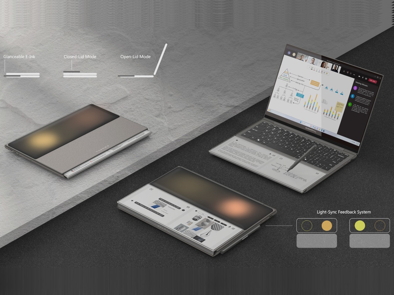 AI Book是仁宝(Compal)提出的一款笔记本电脑概念,其核心设计是在传统掌托区域嵌入一块支持触控笔输入的E Ink电子墨水屏,将原本闲置的空间转化为辅助信息界面。用户可以在该区域记录手写笔记、绘制草图或查看待办事项,而电子墨水屏在断电或合盖状态下仍可保持内容显示,使信息持续可见。该屏幕通过铰链结构设计,可在合上电脑时向外翻转,从而在无需打开主屏幕的情况下显示通知、日历或笔记。同时屏幕边缘还保留一条窄信息带,用于被动显示简单内容。该概念试图重新利用笔记本电脑中被忽视的交互空间,使设备在主屏幕之外形成低干扰的信息记录与浏览区域。