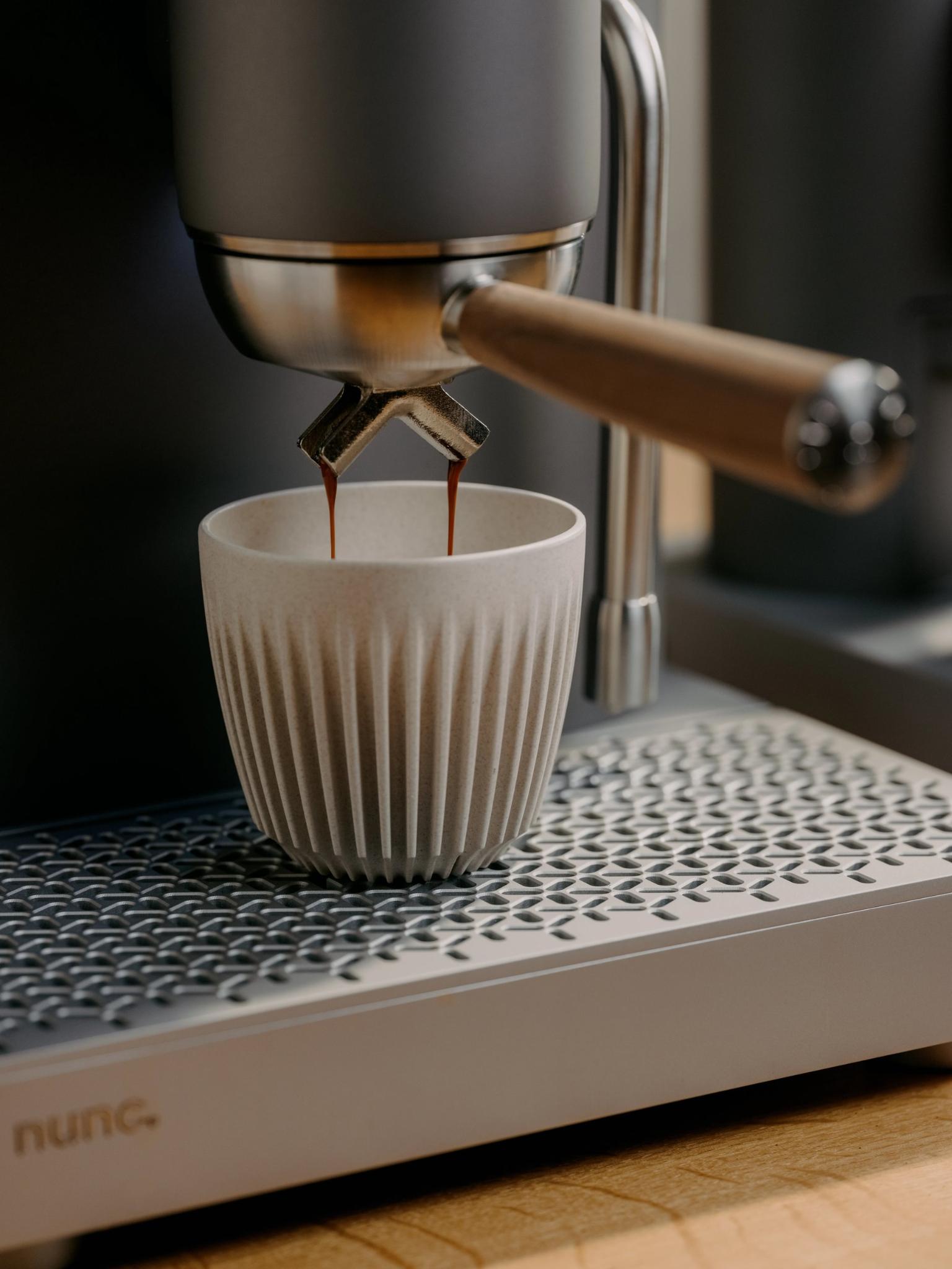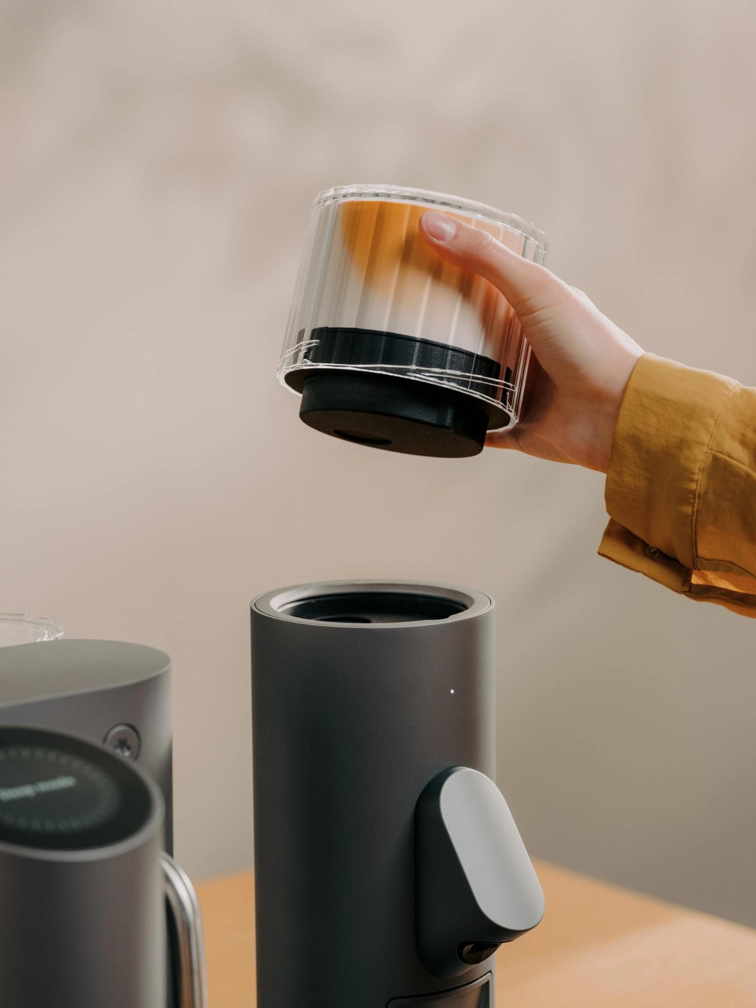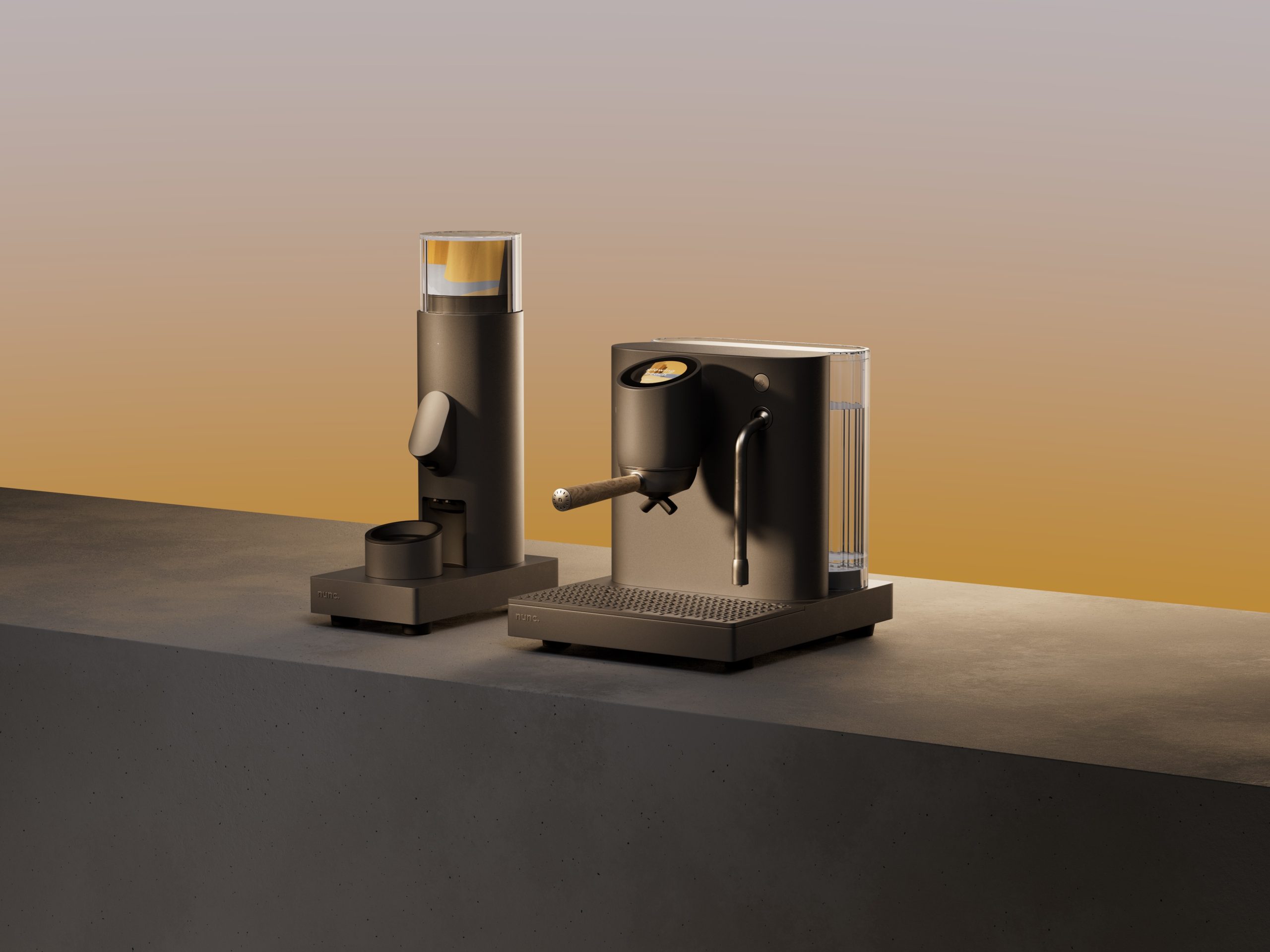 Nunc. 是一款强调极简与可持续理念的家用意式咖啡机系统,其设计核心在于“去复杂化与系统整合”。整体外观采用高度克制的几何体块与纯净界面,弱化传统咖啡机复杂按钮与机械感,使操作更直观。通过统一的材料语言与隐藏式结构,产品呈现出接近家居摆件的视觉状态。包装与咖啡耗材采用单一材料设计,提升可回收性,并通过系统化设计减少能源消耗,最高可节约约90%能耗。EOS相关技术理念(EOS以增材制造为核心,通过数字化与材料创新,实现高自由度设计、低浪费生产与可持续制造,推动工业从“减材逻辑”向“生成逻辑”转变。)在其系统化思维中也有所体现。整体设计将设备、耗材与使用体验整合为完整生态,体现出从“产品”向“系统设计”的转变。