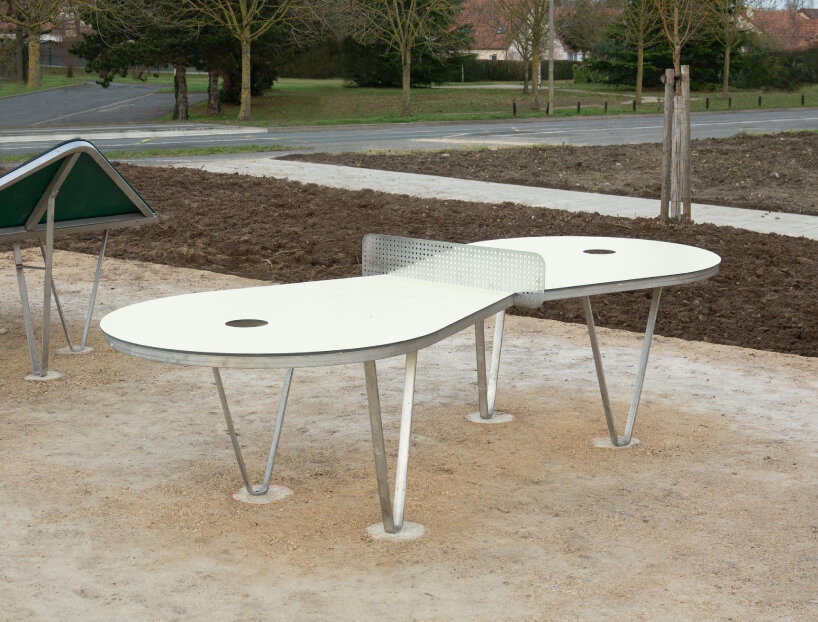法国英格雷的公园里,多了四张乒乓球桌。三角的、椭圆的、六边形的,台面一边平一边斜,中间还开个洞。球可能穿过去,也可能弹到奇怪的方向。规则?没有。玩家自己发明。Exercice设计这些桌子时,没打算让你正经打比赛。不锈钢腿往外撇,固定在圆形地板上,像雕塑。颜色是珊瑚粉、浅蓝、青绿,哑光的,跟公园融在一起。网是穿孔金属板,球过去的声音都不一样。非玩家也能凑过来,围着桌子聊天。它不挑战你的球技,只邀请你过来玩。
